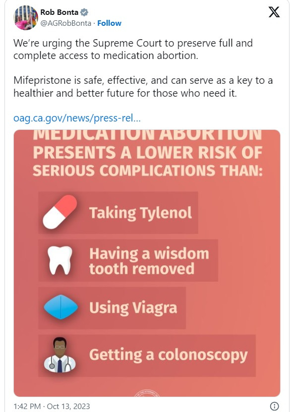 To millions of Americans, meaningful access to medication abortion serves as a lifeline, and a key to a healthier and better future. Medication abortion has been recognized for decades as exceedingly safe and effective — so safe that it presents a lower risk of serious complications than taking Tylenol, having a wisdom tooth removed, using Viagra, or getting a colonoscopy. - said Attorney General Bonta.