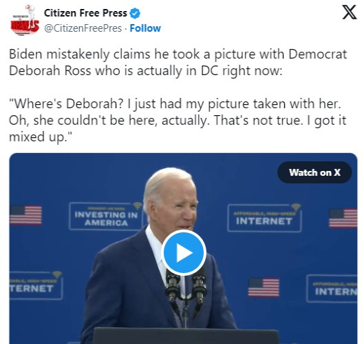On January 18th, 2024, during a speech in North Carolina, Biden mistakenly claimed to have just seen Representative Deborah Ross. Biden said, "Where's Deborah? As he scanned the crowd searching for Ross. “I just had my picture taken with her, that's probably why she left," However, Ross was not in attendance: It turned out that Ross was in Washington DC, not at the event in North Carolina.
